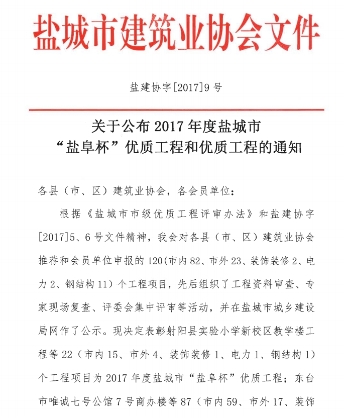 [2017]5、6号文件精神,我会对各县(市、区)建筑业协会推荐和会员单位申报的120(市内82、市外23、装饰装修2、电力2、钢结构11)个工程项目,先后组织了工程资料审查、专家现场复查、评委会集中评审等活动,并在盐城市城乡建设局网作了公示。现决定表彰射阳县实验小学新校区教学楼工程等22(市内15、市外4、装饰装修1、电力1、钢结构1)个工程项目为2017年度盐城市“盐阜杯”优质工程;东台市唯诚七号公馆7号商办楼等87(市内59、市外17、装饰装修1、电力1、钢结构9)个工程项目为2017年度盐城市优质工程,并予以公布。